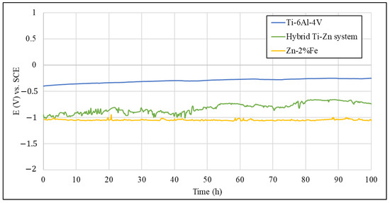 A further electrochemical behaviour examination was carried out using open circuit analysis of the hybrid system compared with its separate alloys, as shown in Figure 6 and Table 4. The results demonstrate that the open circuit potential of the hybrid material falls between the open circuit potential of its two constituent materials. Furthermore, the potential of the hybrid system is less stable than the Zn-based alloy that experiences the corrosion. This can be attributed to the micro-galvanic effect between the absorbable alloy and the Ti-based lattice, which makes the Zn-based alloy more prone to corrosion.