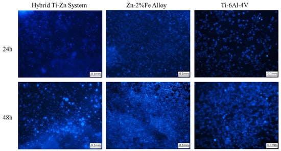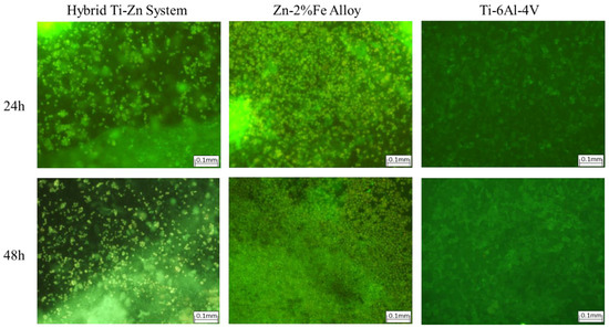 In addition to cell adherence, cell viability was assessed to determine the cytotoxicity of the tested materials. In terms of cell viability, the adhered cell viability was tested using a Live and Dead Cell Assay, as shown in Figure 9. For cells adhered to both the hybrid Zn-Ti system and the Zn-based alloy, a relatively small amount of the cells is tinted red, which suggests that their plasma membranes are compromised, while most of the cells were alive. This demonstrates that the alloys investigated have acceptable biocompatibility in direct contact in vitro conditions.