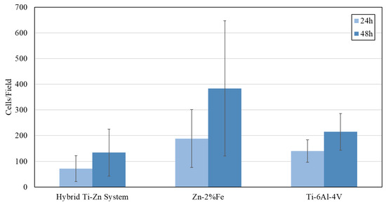 Direct cytotoxicity analysis of Hybrid Ti-Zn system was carried out following incubation periods of 24 h and 48 h, as shown in Figure 7. The ability of cells to adhere to the alloys and their viability provide critical information regarding the biocompatibility of the experimental hybrid implant material. We found an increase of almost 100% in cell amount from 24 to 48 h of incubation for all the tested alloys, as shown in Figure 8. The smaller number of cells in the hybrid Ti-Zn system of 72 and 134 cells/field after 24 and 48 h, respectively can be attributed to the uneven surface of the samples. This was due to accelerated inhomogeneous corrosion of the bioabsorbable alloy in the hybrid system, which interfered with the cell seeding process. Cells usually prefer uneven surfaces; thus, the rugged surface of the biodegradable alloy should enhance adhesion. Nonetheless, the results showed a reduced number of adhered cells that can also be attributed to low field depth of the microscope with inability to observe different surface heights simultaneously. Notably, the number of adhered cells to the hybrid material has nearly the same magnitude as in the case of the inert Ti-6Al-4V that was used as positive control (140 and 215 cells/field, respectively), and therefore showed promising prospects. In comparison, the Zn-2%Fe alloy by itself has a cell count of 188 and 380 cells/field after 24 and 48 h that exceeded both the Ti-6Al-4V and Ti-Zn system, which implies that this alloy promotes cell multiplication and adhesion, as desired for bone implant applications. Those findings were basically in accordance with the observations of Avior et al. [28].