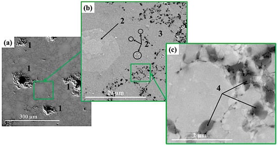 SEM image of materials obtained by MEAM-HP with subsequent sintering at 1100 ± 20 °C: × 550 (a), ×8300 (b), ×82 800 (c).