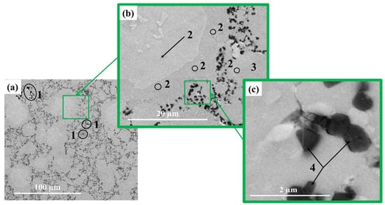 Structures of materials obtained by sintering at different temperatures are represented by areas which have different contrast. In the matrix material of the Ti-Al intermetallide (area 3 in Figure 4b, Figure 5b and Figure 6b, respectively), large areas and particles of a lighter colour are observed (area 2 in Figure 4b, Figure 5b and Figure 6b, respectively) as well as black-coloured particles. Areas with different contrast are supposed to correspond to different phases present in the materials. In the structure of the materials obtained at the sintering temperature of 1100 ± 20 °C, isolated light-coloured areas and particles prevail, and do not exceed 30 µm in size. As the sintering temperature is raised to 1200 ± 20 °C and 1250 ± 20 °C, the size of light-coloured areas and particles increases to 50–60 µm and an isle structure is formed inside them. It is assumed that the growth of the size of areas and the formation of an isle structure is related to the processes of crystallite re-crystallisation in the phases present in the materials [,]. Figure 7b shows maps of chemical elements distribution. The results of energy-dispersive analysis of local areas of the materials structure are shown in Figure 6c and Table 2. Titanium and aluminium are the main elements present in the materials structure, and their concentration changes depending on the area in question. Nitrogen elements are concentrated in local areas (area 1 and 2) and in small particles; nitrogen corresponds to a lighter tint in the structures presented in Figure 3, Figure 4 and Figure 5. By matching the obtained results against X-ray diffraction images and SEM images of the structures of the sintered materials, it was possible to determine the distribution of phases in the materials. It was found that the materials structure comprises an AlTi matrix with Ti2AlN MAX-phase particles distributed within it and surrounded by a composite layer of Ti3Al-Ti2AlN. From the research findings, it was established that this layer is a transitional layer during the emergence of the Ti2AlN MAX phase in the process of Ti3Al intermetallide reaction with nitrogen. The research findings affirm the assumption that the Ti3Al phase interacts more intensely with nitrogen compared to the TiAl phase, and it is the main source of the emergence of the Ti2AlN MAX phase.