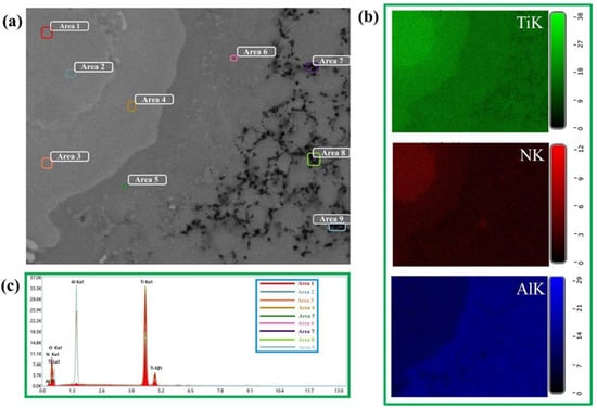 Elementary analysis of more contrasting particles (areas 7–8 in Figure 7a) present in the materials has shown the prevalence of elements of aluminium and oxygen, as well as the absence of elements of titanium and nitrogen. These particles are supposedly aluminium oxide. However, the aluminium oxide phase was not discovered by X-ray diffraction analysis, which is most probably due to its weak intensity compared to other phases, as well as its weight ratio below 5 wt%, which cannot be detected by XRD analysis techniques. It is assumed that Al2O3 particles emerged in the course of interaction of the aluminium component in α-Ti with titanium monoxide via aluminothermal reduction [].