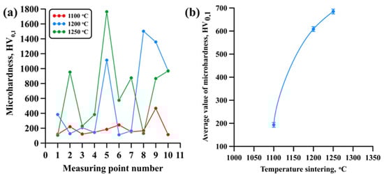 Figure 8a shows an image of the distribution of hardness in material samples obtained via AM extrusion using a mixture of high-filled polymers (MEAM-HP) and Ti-Al intermetallide powders with subsequent sintering at 1100 ± 20 °C, 1200 ± 20 °C and 1250 ± 20 °C, respectively. It was found that materials sintered at 1100 ± 20 °C have close to linear hardness distribution, with rare minor deviations. Hardness varies in the range from 113 to 470 HV0.1, and the average value is 193 HV0.1. Increasing sintering temperature to 1200–1250 ± 20 °C leads to a significant distortion of hardness distribution in the samples obtained, which is represented by distinct peaks. The value of hardness is rapidly changing in the range between 115 and 1500 HV0,1 (at the sintering temperature of 1200 ± 20 °C), and it reaches 1760 HV0.1 (at the sintering temperature of 1250 ± 20 °C). Here, the average microhardness of the samples increases from 193 to 690 HV0.1 as the sintering temperature is raised from 1100 ± 20 °C to 1250 ± 20 °C (Figure 8b).