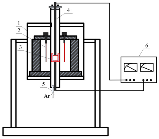 The experimental equipment is shown in Figure 1. The experimental equipment is mainly composed of the high-temperature tubular resistance furnace, the temperature measurement and temperature control system, the external power supply system, the argon gas protection system, and the water cooling system. The additional power supply equipment includes: a multi-function pulse power supply (output voltage 0–36 V, output frequency 0–500 KHz), and a Pratt and Whitney multi-function oscilloscope.
