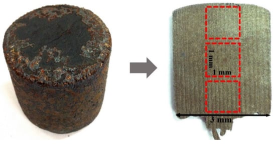 In the experiment, the steel ingot was heated and melted in the furnace under the protection of argon gas; the temperature was raised to and then kept constant at 1580 °C. In the constant temperature stage, a pulse power supply was introduced for the experiment using electrification treatment, and the electrification treatment time was 30 min. Then, when the temperature in the furnace dropped to 1300 °C, the crucible was quickly lowered into the water tank for water quenching. Several groups of experiments were carried out in the up-and-down energization experiment on liquid steel. The blank sample was not electrified, and other operating conditions were consistent with the energization experiment. The specific parameters of the pulse current were as follows: the current density was 0.1–3 A/cm2, the frequency was 100 Hz, and the pulse waveform was a square wave. The energized samples and the control samples were axially sectioned to prepare metallographic samples, The schematic diagram of the sampling location and size is shown in Figure 2. The number and particle size of the inclusions on the surface of the samples were statistically analyzed using an Olympus DXS510 microscope and a scanning electron microscope equipped with INCA software (Oxford Instruments INCA steel, BEIJING HONGCHANG TECHNOLOGY CO. LTD., Beijing China). The composition of the inclusions was determined by SEM-EDS analysis.