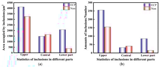 The number and size distribution of inclusions in different parts (upper, middle, lower) in Figure 3 were statistically analyzed, as shown in Figure 4. Figure 4a shows the area occupied by the inclusions in different parts (400 μm × 400 μm), and Figure 4b shows the number (quantity) of the inclusions in different parts (400 μm × 400 μm). According to the figure, the number of non-metallic inclusions (or the proportion of inclusions in the statistical area) in the sample treated by pulse current is more than that in the sample without electrification treatment. Moreover, after pulse-current treatment, the number of inclusions (or the proportion of inclusions in the statistical area) in the upper and lower parts of the sample is more. However, the number of inclusions in the middle part is basically consistent with the result without electrification treatment.