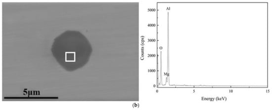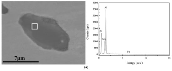 Microscopic analysis of inclusions in the energized and non-energized samples was carried out, as shown in Figure 5. The inclusions in the sample were mainly alumina and a small amount of magnesia alumina spinel (Figure 5). In addition, the alumina inclusions in the samples after electrification treatment were obviously finer, the particle size was concentrated in 2–5 μm, and the shape tended to be spherical. The particle size of inclusion in the sample without electrification treatment was relatively large, and the particle size was concentrated at about 10 μm. The inclusion size statistics are shown in Table 2. The statistical results in Table 2 show that the formation of small particle inclusions in the steel is promoted by the pulse current, and the particle size of the small particle inclusions is concentrated at 2–5 μm.