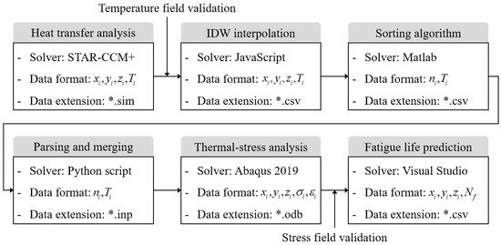 First, the temperature distribution of the solid mesh was obtained by CFD. The temperature data are in the polyhedral centroid mesh because CFD uses a finite volume method (FVM) solver. For this reason, transient CFD results were interpolated to nodes by the inverse distance weighted (IDW) method. Next, the storage data in the FVM were changed to suit the FEA through the sorting algorithm. Afterward, the input files of the FEA were created by parsing and merging the sorted data. Finally, the thermal stress was calculated, and the fatigue life of the die could be predicted. Additionally, all procedures were verified by comparing the simulation results with the actual HPDC process.