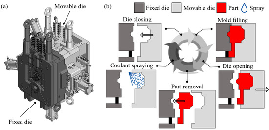 Die casting process overview. (a) Movable and fixed die. (b) The one-cycle process chain of HPDC.