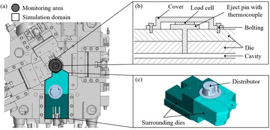 Fatal breakage arises on the distributor of the movable die, where temperature differences occur significantly. Therefore, the simulation area was selected as a distributor and a peripheral die. This modeling significantly contributed to the reduction in the analysis time by excluding the unnecessary area. Temperature and pressure data measured by the thermocouple and load cell were applied as boundary conditions for the distributor of the movable die. The numerical analysis domain and the data measurement method are shown in Figure 5.
