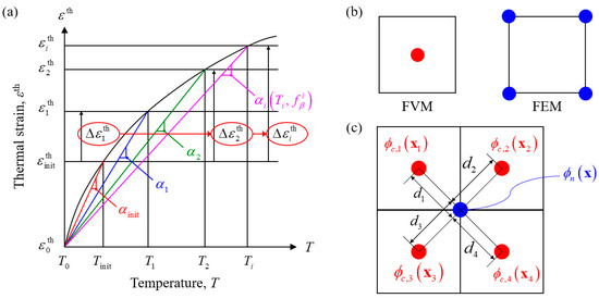 Definition of thermal expansion and the IDW method. (a) Determining thermal strain by the incremental concept. (b) Computational points of FVM (left) and FEM (right). (c) Distance between FVM and FEM points in IDW method.