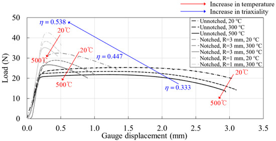 Load–displacement curves of the tensile experiments for the unnotched and notched specimens at 20, 300, and 500 °C environmental temperatures.