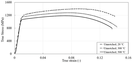 The load–stroke and the true stress–strain curves relevant for the unnotched and two types of notched specimens are reported in Figure 9 and Figure 10, respectively. The effects at three different environmental temperatures (20, 300, and 500 °C) can be confirmed. As the experiment operating temperature increases, AISI H13 steel significantly reduces yield and tensile strength. In addition, the different triaxialities caused by the three dimensions of specimens (R = 0, 1, and 3 mm) changed the fracture displacements. When a material is subjected to a complex stress state due to increased triaxiality, fracture occurs more quickly, reducing fracture strain and stress.