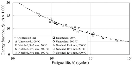 Failure cycles from 102 to 105 were considered for all temperatures and triaxiality. The true stress and strain associated with the unnotched specimens were calculated immediately. The data of notched specimens could not be obtained directly due to the complex geometries; hence the stress and strain were gathered through FEA results. All values were acquired from the last stabilization cycle. The difference between the selected and fracture cycle was less than 5% in terms of maximum and minimum displacement. All fatigue test conditions, fracture cycles, and the energy function values worked out by the proposed semi-empirical model are presented in Table 6. The developed model constants, A and c, are equal to 0.05762 and −0.2143, showing high accuracy with the 0.976 correlation factor. The regression line, calculated by the obtained model parameters, and an energy function vs. the number of failure cycles are shown in Figure 11.