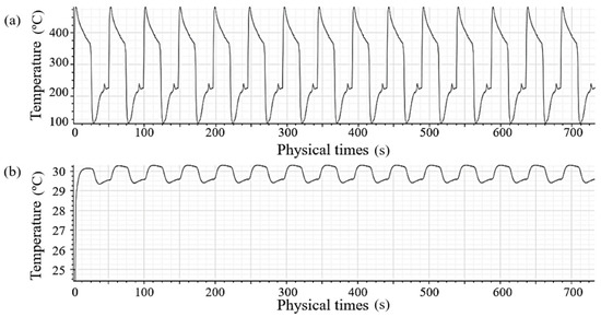 The proposed one-way coupled method was used to evaluate the molten metal and cooling water’s temperature distribution and thermal stress. Verification was performed for each analysis stage. First, the thermofluid analysis was performed 20 times to consider that the die was heated due to molten metal from atmospheric temperature. The temperature convergence results at the die and the outlet of the coolant are shown in Figure 12. After convergence, the simulation was conducted for one more cycle and utilized for thermal stress analysis.