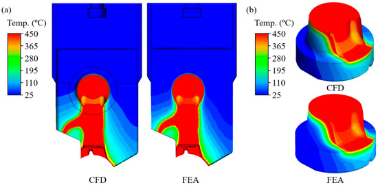 The thermal analysis compared the temperature between the infrared camera measurement and the simulation results at the same point of the die. The deviation of the two measured results was 2.19%, confirming the rationality of the adopted heat transfer coefficient and boundary conditions (Figure 13). Finally, the verified CFD temperature calculation results were mapped to FEA. The temperature distribution comparison for the thermal and structural analyses is shown in Figure 14.