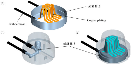 Various cooling channel models to validate the fatigue life prediction methodology. (a) Copper plating conformal cooling channel model (Cu CCC). (b) H13 straight drilled channel model (SDC). (c) AISI H13 conformal cooling channel model (H13 CCC).