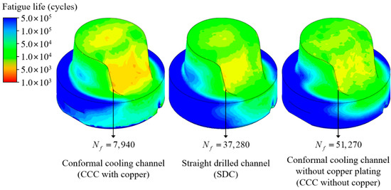 The die is subjected to a more severe temperature change with the increase in cooling efficiency. The fatigue life of die designs with three cooling channels was investigated to verify the presented fatigue life prediction procedure. Out of the three models, the CCC with copper plating had the highest cooling efficiency but also the lowest fatigue life. The SDC had lower cooling efficiency because less surface area was in contact with the die compared to the copper-plated cooling channel; however, the fatigue life increased as the temperature distribution was maintained uniformly. Despite its lower heat transfer efficiency, the AISI H13 CCC shows a fatigue life of nearly seven times that of the copper-plated channel. The results show that if the cooling channel design is solely focused on lowering the temperature of the die, it can lead to a distinct disadvantage in terms of the die replacement time.