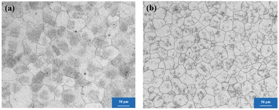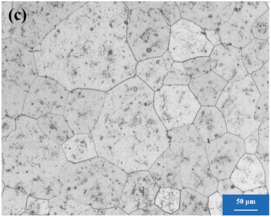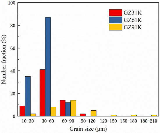 The OM micrographs of the T6-treated Mg-xGd-1Zn-0.4Zr alloys with different Gd contents are shown in Figure 1. The microstructures of the three alloys are composed of α-Mg matrix grains and tiny precipitates, which are distributed at grain boundaries and interiors. The matrix grains of GZ61K are the smallest and evenly distributed, while those of GZ91K are coarse and clearly unevenly distributed. The grain size distribution of the three alloys is shown in Figure 2, which shows that the grain size distribution of GZ61K is the most uniform. The average grain size of the three alloys is about 48.3, 41.9, and 76.7 μm, respectively, indicating that the grain size of the alloy increases first and then decreases with the increasing Gd addition.