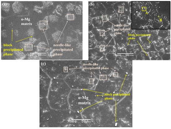SEM images of the T6-treated alloys. (a) GZ31K, (b) GZ61K, (c) GZ91K.