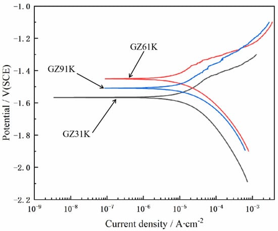 The representative polarization curves of the specimens are plotted in Figure 4 and the electrochemical parameters fitted by Tafel extrapolation are listed in Table 3. All the samples have similar cathodic polarization curves. The corrosion potential reflects the corrosion tendency of the alloy from the perspective of thermodynamics. The more positive the corrosion potential, the less the corrosion tendency of the alloy [38]. Therefore, from the perspective of thermodynamics, the GZ61K alloy has the best corrosion performance, followed by the GZ91K and GZ31K alloys. However, there is no direct relationship between the corrosion potential and rate. The corrosion current density determines the corrosion rate of the alloy from the perspective of dynamics. The lower the corrosion current density, the better the corrosion resistance of the alloy [39]. The order of corrosion rate from high to low is GZ91K > GZ31K > GZ61K, indicating that the GZ61K alloy has the best corrosion resistance and the GZ91K alloy shows the worst corrosion resistance in this work.
