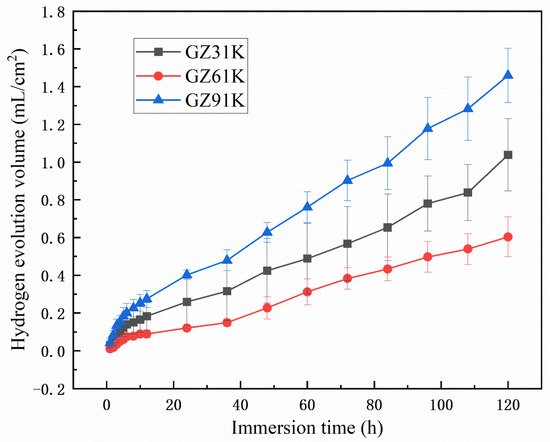 Figure 6 shows the hydrogen evolution of the T6-treated alloys immersed in SBF for 120 h. The hydrogen evolution trend of the alloys with different Gd contents is the same, but the amount of hydrogen evolution is different. The GZ91K alloy has the most hydrogen evolution, followed by the GZ31K and GZ61K alloys. At the initial stage of soaking (the first 8 h), the hydrogen evolution amount of the specimens is lower than 0.3 mL/cm2. The amount of hydrogen evolution increases with the increase in soaking time. After soaking for 120 h, the hydrogen evolution of the GZ31K, GZ61K, and GZ91K alloys reaches 1.04, 0.60, and 1.46 mL/cm2, respectively.