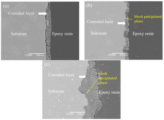 The cross-section morphologies of the T6-treated alloys after immersion in SBF for 120 h are shown in Figure 7. It clearly shows that the GZ61K alloy has the thinnest corrosion layer while the GZ91K alloy has the thickest corrosion layer. The GZ31K and GZ61K alloys present a more uniform corrosion mode than the GZ91K alloy. Moreover, it is worth noting that the block Mg5Gd precipitated phase remains in the corroded layer in Figure 7b,c, indicating that the Mg5Gd is more corrosion resistant than the α-Mg matrix.