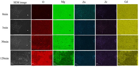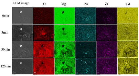 To further reveal the corrosion behavior of the alloys, quasi in situ corrosion was carried out using SEM to characterize the corrosion process. After the sample was immersed in SBF solution for 0, 3, 30, and 120 min, the EDS maps of Mg, Gd, Zn, Zr, and O were collected to observe the distribution of elements, and the corrosion morphology of the alloy was observed.