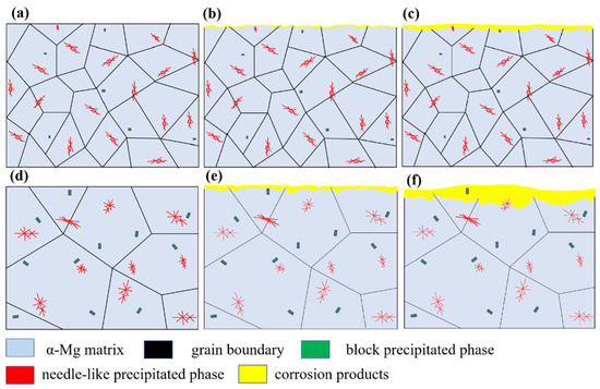 Schematic diagrams showing corrosion processes of T6-treated GZ61K (a–c) and GZ91K (d–f) alloys.