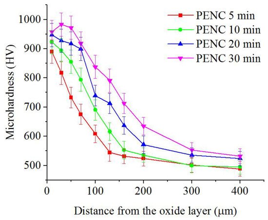 3.4. Microhardness of the Diffusion of the Nitrocarburized Layer