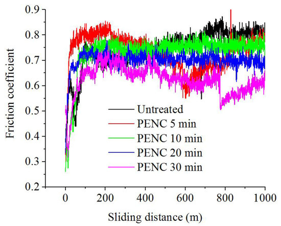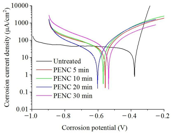 | PENC Time (min) | Weight Loss of Samples during PENC (mg) | Surface Roughness, Ra (μm) | Average Friction Coefficient for the Last 100 m of Track | Weight Loss of Samples during Tribological Test (mg) | Corrosion Current Density (μA/cm2) |