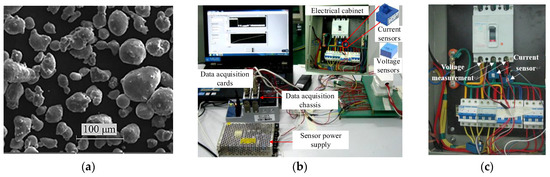 Experimental setup: (a) SEM images of the AlSi10Mg powder shape; (b) Energy data acquisition equipment; (c) Placement of the energy data acquisition equipment in the SLM machine.
