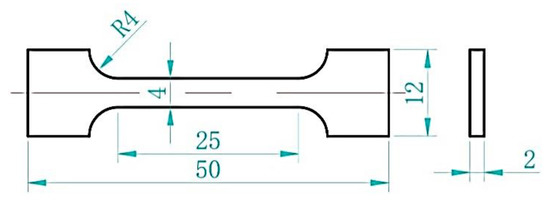 Multiple layer samples were fabricated with laser powers (320 W, 360 W, 400 W), scan speed (600 mm/s, 750 mm/s, 900 mm/s) and overlap rate (0.25, 0.30, 0.35). A checkerboard linear scanning strategy was chosen during the fabrication of test specimens. The linear scanning direction rotates at 67° for the next processing powder layer [40]. Processing conditions for the multiple layers were selected because the tracks in the single layer are well-connected. For each combination of parameters, one cuboid sample with a dimension of 10 mm × 52 mm × 14.5 mm was produced, as shown in Figure 2b. A total of 27 cuboid samples were manufactured to make tensile examples. Electrical discharge machining (EDM) cut the samples from the substrate. Each cuboid bulk part was further cut into three samples for tensile strength testing, as shown in Figure 3. The width and length of the narrow sample section were 4 mm and 25 mm. The tensile sample’s thickness and total length were 2 mm and 50 mm. The tensile standard was designed according to GB/T228.1-2010. Measurements were conducted thrice for each processing condition, and the average tensile strength values were reported.