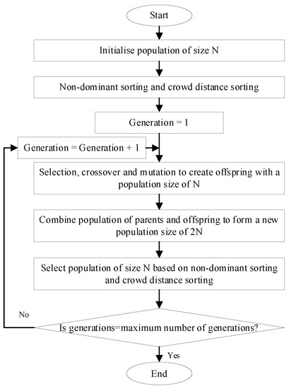 The NSGA-II is selected to solve the multi-objective optimization problems owing to its wide use in engineering. NSGA-II is an extension version of NSGA [46]. Figure 4 shows the flow chart of NSGA-II. At the beginning of the algorithm, an initial population of size N is randomly generated. All the individuals of are sorted using the non-dominant sorting and crowding distance sorting procedures. For each individual, the non-domination ranks and crowding distance are assessed. An individual X dominates individual Y if X is not worse than Y in all objectives and strictly better than Y in at least one objective. The individuals that are not dominated by any other individuals in the objective space constitute the non-dominated set at the first level (Pareto front with rank 1). The individuals that are dominated only by individuals with non-domination rank 1 form the Pareto front 2 and so on [47]. The crowding distance of an individual is the sum of the distance between the individual and its left and right neighbors for each objective function, which is calculated as [48]