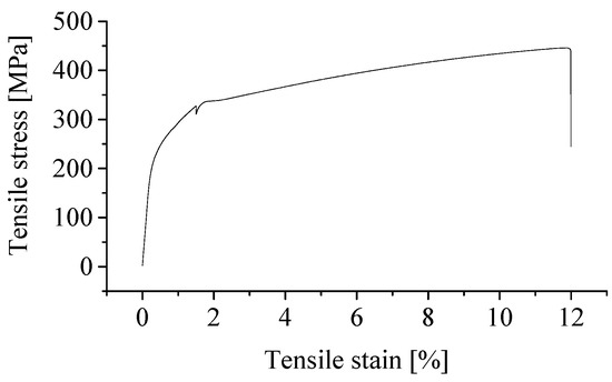 The tensile samples were cut from the SLMed cuboid bulk part. Then the samples were tested to obtain the tensile strength. When laser power, the scan speed, and the overlap rate are 360 W, 900 mm/s, and 0.35, respectively, the tensile curve of the sample is shown in Figure 6. The tensile strength of this sample is 446.7 MPa.