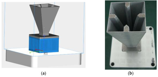 The waveguide part: (a) Three-dimensional models; (b) Finished parts (part volume: 19,954 mm3, support structures volume: 6557 mm3). The values of part volume and support structures volume were obtained through the three-dimensional models in the CAD software.