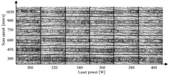 Optical images of the surface morphologies of the single track samples with laser power ranging from 300–400 W and scan speed ranging from 300–1050 mm/s.