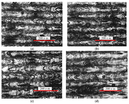 Surface morphologies of SLM-processed AlSi10Mg single layers. The process parameters are: laser power: 320 W, scan speed: 750 mm/s and overlap rate at: (a) 0.2; (b) 0.25; (c) 0.3; (d) 0.35.