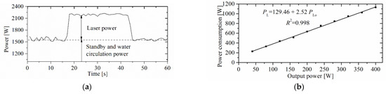 Figure 10 shows the measured basic power and recoater motor power. The power fluctuates due to the intermittent running of the heater and water-cooling unit. Thus, the average values of = 52.1 W and = 1981.7 W represents the recoater motor power and basic power, respectively. The average values of and are both arithmetic mean. The average value of is the average power consumption of recoater motor in the time of 11 s to recoat one layer, as shown in Figure 10a. The average values of is the average of the basic power from 0 s to 6000 s, shown in Figure 10b. The power consumption of a single laser is measured, and its power model is obtained via regression analysis, as shown in Figure 11.