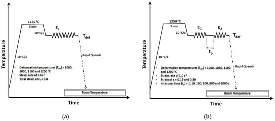 Diagram of the thermomechanical cycles applied: (a) continuous isothermal compression test; (b) double-pass hot compression test.
