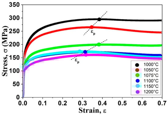 Stress–strain curves resulting from continuous isothermal hot compression tests performed at different strain temperatures.