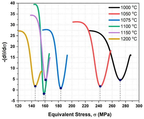 Figure 2 illustrates the stress–strain curves produced by continuous isothermal hot compression tests at different temperatures. Note that these curves initially present a stage of work hardening (WH) in which stress increases continuously, particularly at low temperatures. The flow curves at 1100–1150 °C show closer stress levels. This is due to hot deformation which favors the dynamic softening processes (dynamic recovery—DRV and dynamic recrystallization—DRX) to occur simultaneously and predominate over the work-hardening (WH). Under these conditions, the intense thermal vibration facilitates the diffusion of atoms, the mobility and annihilation of dislocations, contributing to the elimination of dislocations leading to the formation of new grains. The curvature of all stress–strain curves changes as deformation continues, indicating the occurrence of DRX at strain levels below εc < 0.30. This can be determined analytically by applying the differentiation method of Poliak & Jonas [], depicted in Figure 3, whose highest stress level indicates a high WH rate. As deformation increases, the maximum peak strain (εp) is reached, increasing slightly in response to temperature. Lastly, there is a stage of dynamic softening, and the stress level gradually decreases with temperature to an intermediate level, showing strong evidence of DRV until the steady state (εss) is reached.