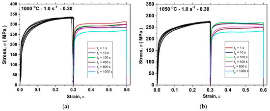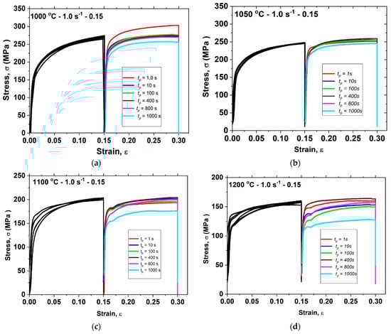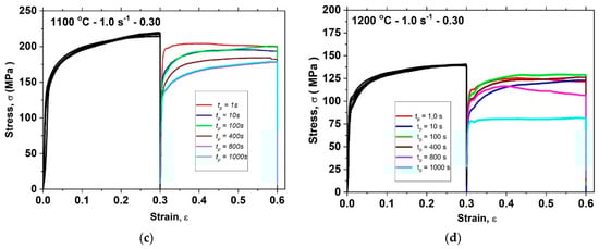Stress–strain curves resulting from double-pass hot compression tests when ε = 0.30 at (a) 1000 °C, (b) 1050 °C, (c) 1100 °C and (d) 1200 °C.