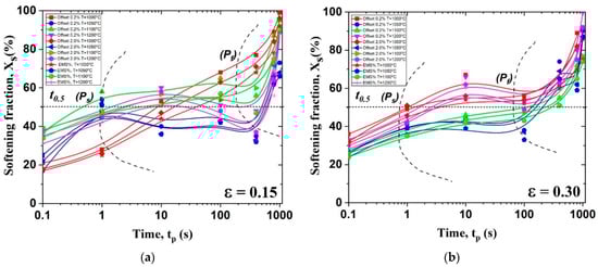 Dependence of the softening fraction (Xs) on time between passes (tp), calculated according to the 0.2% offset method: (a) ε = 0.15, and (b) ε = 0.30.