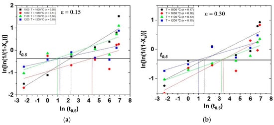 Calculation of the Avrami exponent (n) in the double-pass hot compression tests: (a) ε = 0.15 and (b) ε = 0.30. (1000 °C < T < 1200 °C and 1.0 < tp < 1000 s).