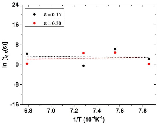 Relationship between 50% softening time (t0.5) and the inverse of absolute temperature, determination of activation energy for static recrystallization (Qs).