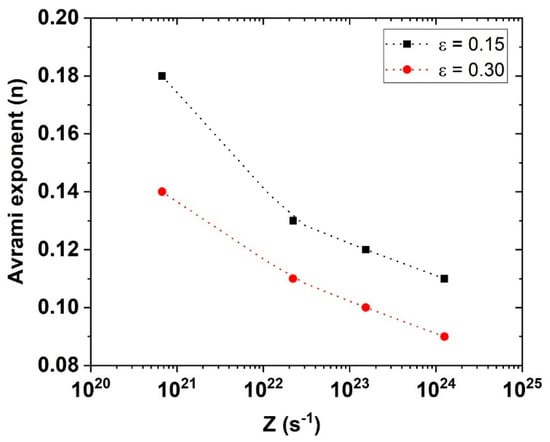 Dependence of the Avrami exponent (n) on the Zener-Hollomon (Z) parameter in the conditions of double-pass hot compression.