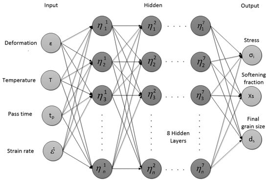 The microstructural evolution of steels during hot forming processes is predicted using physical and phenomenological methods. The behavior of hot deformation of steels is strongly nonlinear, as are many factors that affect the microstructure, which makes the prediction of softening and grain size by linear regression essentially non-applicable. However, a new approach has been applied using ANN in processing simulation and control, solving complex problems without the need to postulate a model with parameter identification []. In this model, an advanced statistical information system with a hierarchical structure of neurons grouped in different layers (input layers, hidden layers and output layers) is applied, with characteristics of adaptive learning parameters, which can not only make empirical decisions but also generalize to other conditions. A disadvantage of this method, however, is that it does not provide a reasonable physical explanation for the model, so it is adapted to fit the Arrhenius–Avrami formalism.