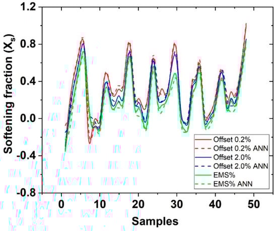 Training the ANN to calculate the softening fraction (Xs) as a function of the number of samples, using the 0.2% offset, 2.0% offset and EMS methods.