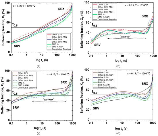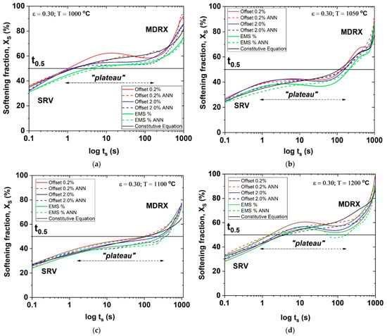 Based on the experimental stress–strain curves obtained in the double-pass hot compression tests, the softening fraction (Xs) was calculated for different temperatures and times between passes (tp) using the 0.2% offset, 2.0% offset and equivalent mean stress (EMS) methods, according to Equations (1) and (2) []: